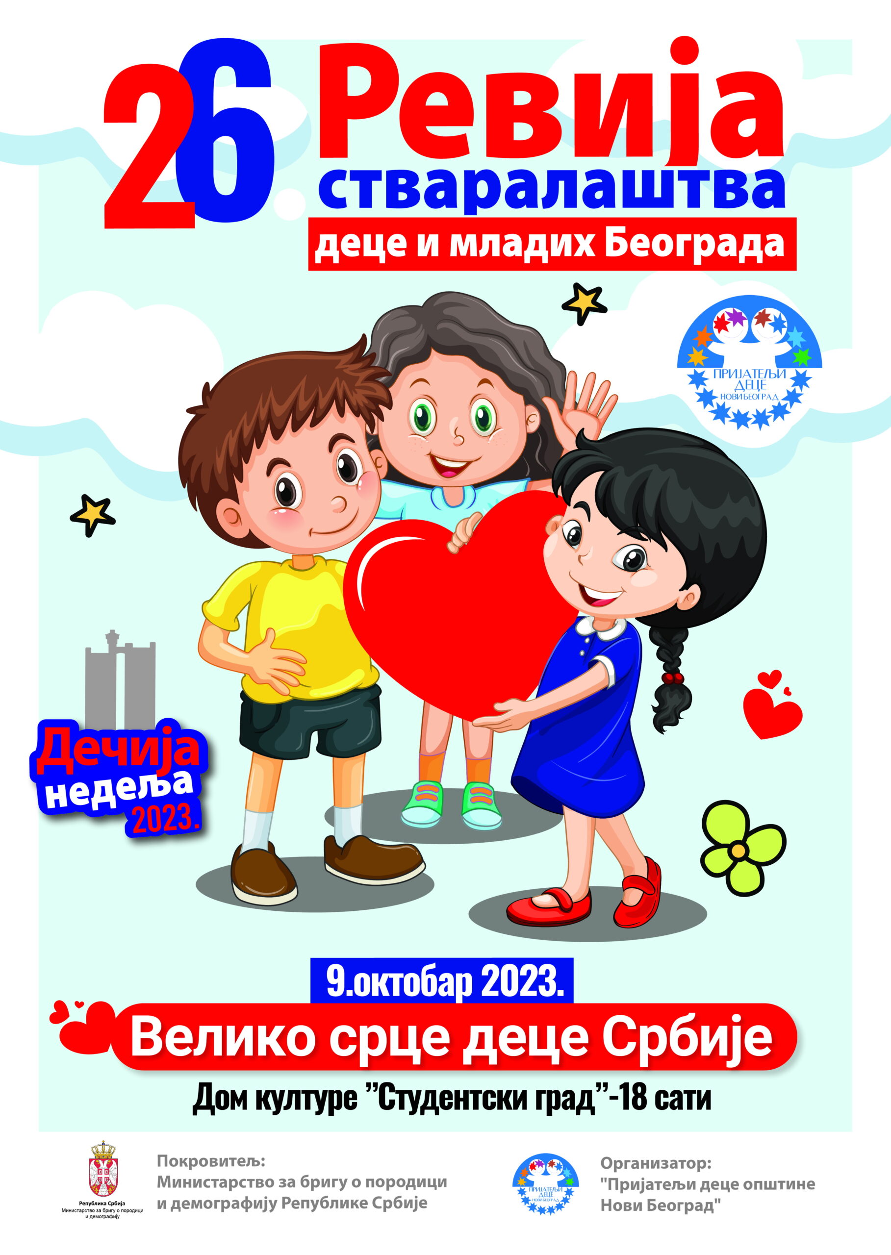 Organizatori 26.”Revije stvaralaštva dece i mladih Beograda”, koja je deo programskih aktivnosti Dečija nedelja 2023., su “Prijatelji dece opštine Novi Beograd”, a pokrovitelj Ministarstvo za brigu o porodici i demografiju.